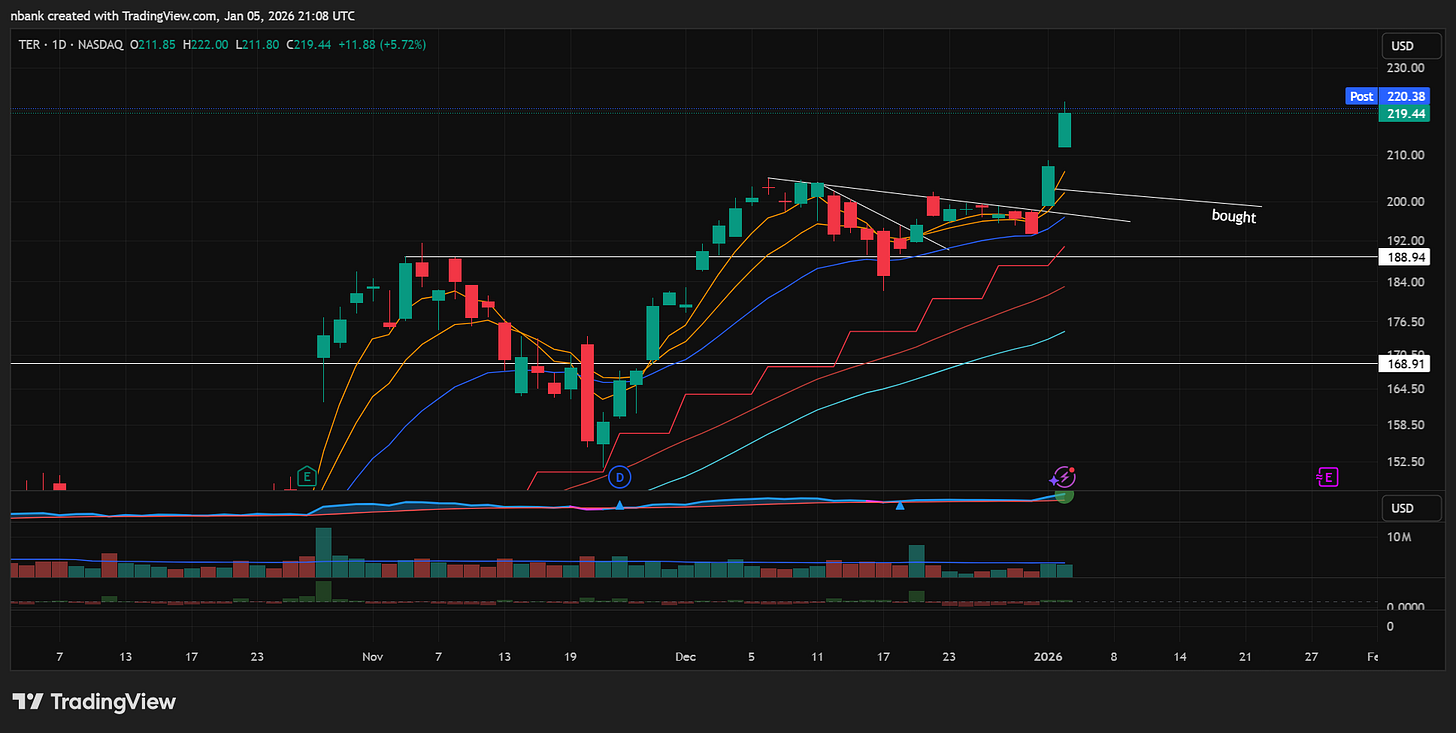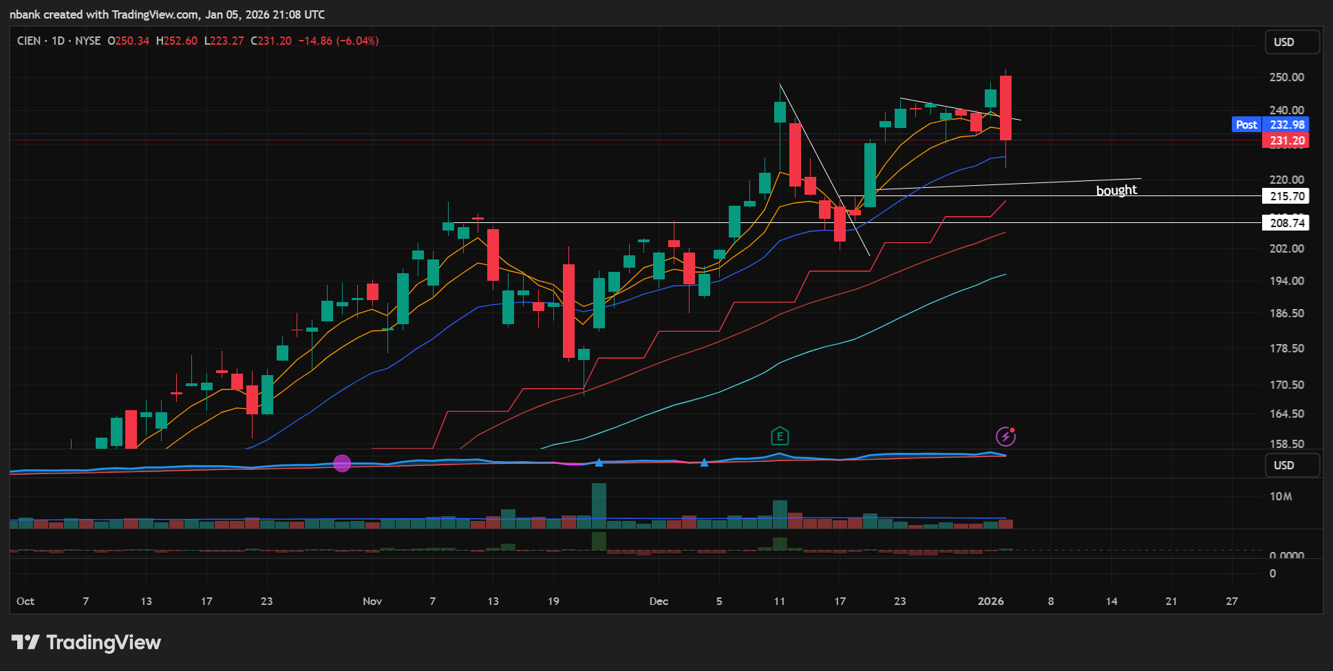 CIEN and it’s group were weak today. Held 20ema in the end. Have stop at breakeven and let it play out. The group is a bit extended so may need to base.